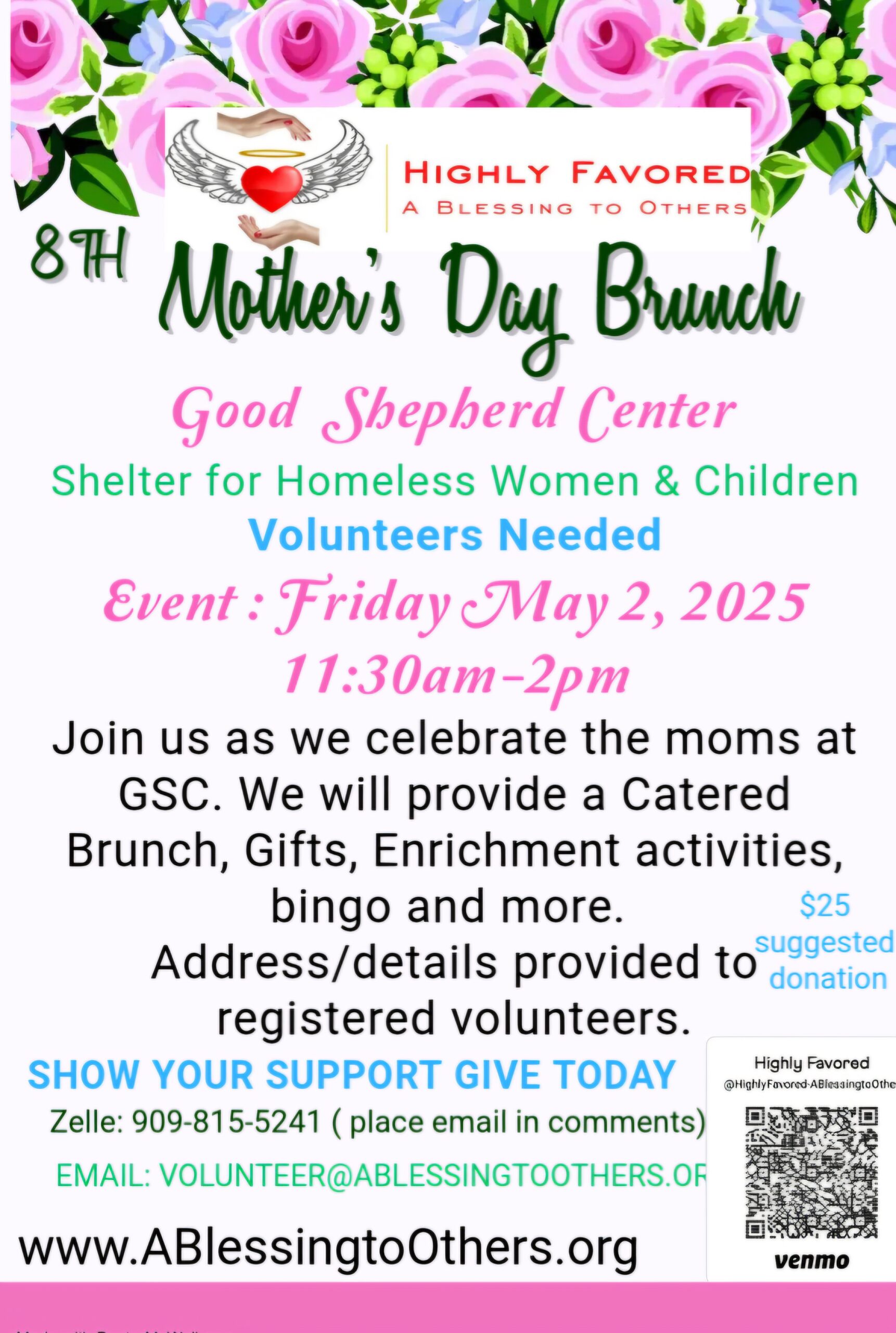 Join Highly Favored: A Blessing to Others, KSRNA, & KDRNA as we host our 2nd annual Mother's Day Brunch. We will be collecting donations to provide a delicious meal for the women and children at the Good Shepherd Center. We are collecting Bath and Body Works Bath Gel and lotion sets to make gift bags for the mothers. We would like to include eye shadow and lipsticks as well. All donations can be coordinated for pick up or mailed to 2851 W. 120th Street Suite E #396 Hawthorne, CA 90250. Please text KSRNA Alexis for details 909-815-5241 or KDRNA Camille 909-815-3949. Thank you for being a blessing to others!